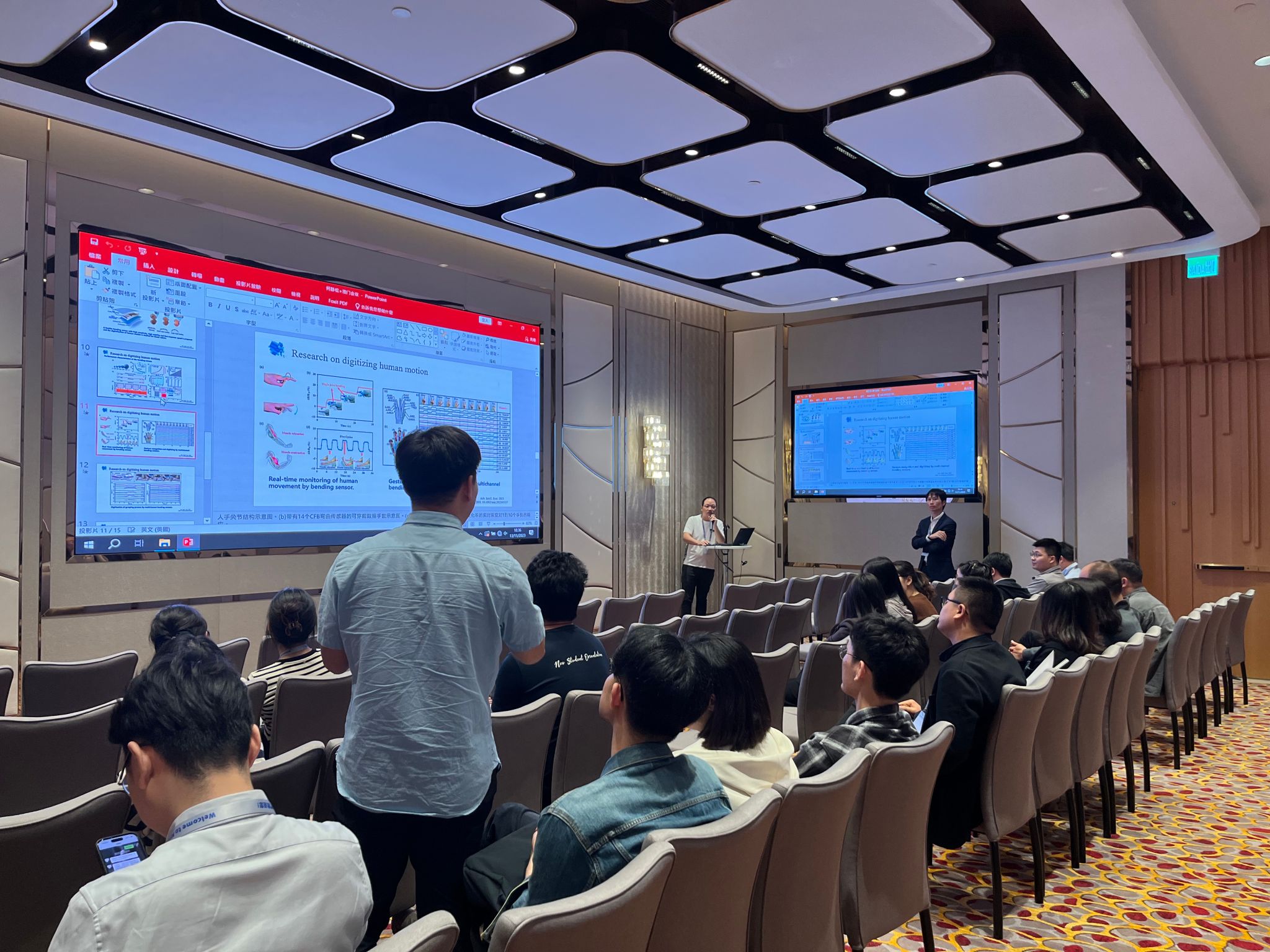 碩士研究生何靜松以題為“Digitizing Human Motion via Bending Sensors”匯報了課題組在柔性彎曲傳感器應用于人體運動數字化方面的研究成果,該研究基于量子隧穿原理通過碳纖維束材料設計了H形結構的柔性彎曲傳感器,它具有雙向識別的功能,實現了對人體手指彎曲的狀態和肘關節膝關節的動作彎曲檢測。并進一步開發了級聯結構的K形柔性彎曲傳感器,它是由3個K形結構級聯而成,然后將柔性彎曲傳感器集成到手套上形成智能手套用于人體的手勢的檢測與識別,最后將柔性彎曲傳感器集成到臂套上用于檢測人體手臂肌肉的發力狀態,最終通過智能手套和臂套對人體手抓取物體的狀態進行檢測與識別,從而實現了人體動作的數字化。