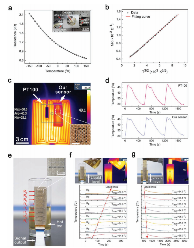 在溫敏傳感機理方面,研究團隊通過雜質散射機制所標定碳纖維材料能夠在-150℃至150℃范圍內保持良好的線性度,且靈敏度接近于商用的PT100傳感器,證明了碳纖維用于制作柔性溫度傳感器的可行性。(圖3)