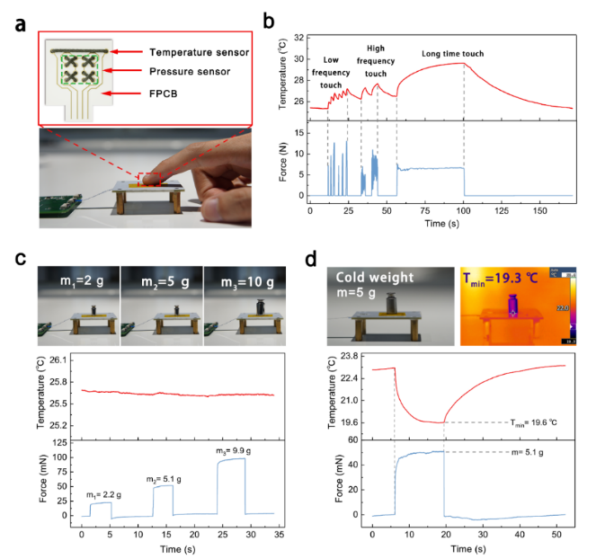 為了真正實現柔性觸覺傳感器,研究團隊通過將基于碳纖維的應力傳感器和溫度傳感器進行集成,組裝出能同時感受應力和溫度的觸覺傳感器(圖4)。基于上述傳感機理模型,通過測試該柔性觸覺傳感器的壓力和溫度信號可得到有效區分,證明了僅用一種材料來實現柔性觸覺傳感器的可能,為后續其他不同功能的傳感器的功能集成提供了可靠的理論指導和設計思路。