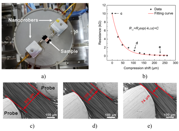 為驗證模型的可行性,研究團隊通過利用SEM原位表征技術,從實驗上進一步驗證了基于碳纖維束交叉結的應力傳感器的可行性(圖2)。該傳感機理模型指出,柔性應力傳感器的形變壓縮量△x與橫向壓敏電阻R⊥成指數型衰減關系,這也表明了碳纖維束的橫向壓敏電阻R⊥對微小形變量十分地敏感,充分具備作為高靈敏度的應力傳感器的應用前景。
