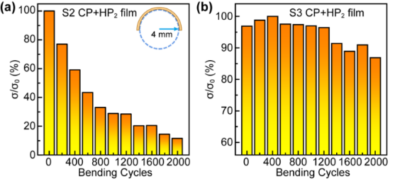 圖2 彎曲穩定性測試。(a)樣品S2制備的Ag2Se/尼龍復合薄膜彎曲2000次后電導率保持11.5 %,(b)樣品S3制備的Ag2Se/Ag/尼龍復合薄膜彎曲2000次后電導率保持89.4 %。