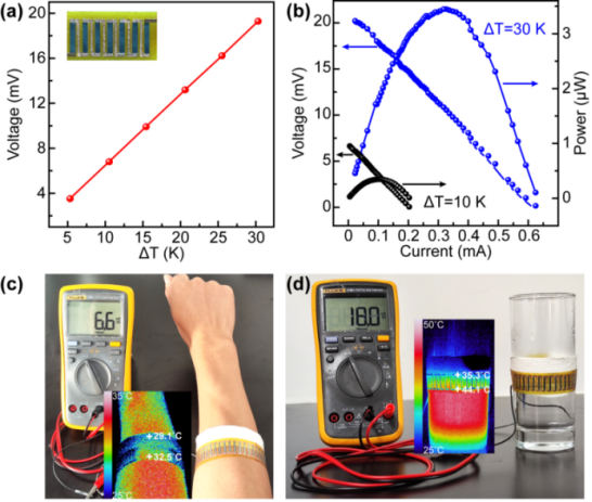 圖3 Ag2Se/Ag/尼龍復合薄膜制備的7腿熱電器件的輸出性能。(a)開路電壓與溫差之間的關系(插圖是7腿熱電器件照片),(b)在?T 為10 K和30 K時的輸出電壓和功率與電流之間的關系。(c)由手臂和環境之間的?T 產生的6.6 mV電壓圖(插圖是23條腿熱電器件相應的紅外熱圖像),(d)在燒杯的上(冷)表面和下(熱)表面之間產生的18 mV電壓的照片(插圖是對應的紅外熱圖像)。