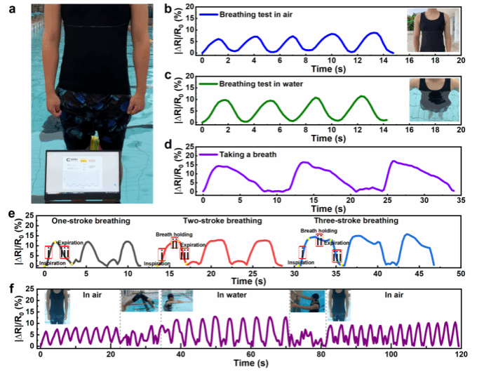 圖5 智能呼吸監測系統在水下呼吸監測中的應用。(a) 智能呼吸監測系統監測效果圖;(b)在空氣中和(c)在水下的正常呼吸監測;(d) 志愿者在水中換氣的呼吸監測,志愿者在水面上吸入空氣,然后在浸入水中時逐漸呼出;(e) 志愿者三種呼吸換氣模式的輸出響應曲線:一劃一呼吸、二劃一呼吸和三劃一呼吸。(f) 志愿者整個游泳過程的呼吸監測。