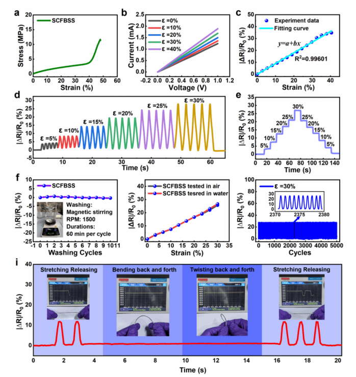 圖3 (a) SCFBSS的拉伸應力-應變曲線;(b) SCFBSS在不同拉伸應變下的I-V特性曲線;(c) SCFBSS的相對電阻隨外部拉伸應變的變化;(d) SCFBSS對逐步增加的循環載荷的動態響應;(e) SCFBSS在0至30%應變范圍內的滯后曲線;(f) SCFBSS在水中洗滌后的電輸出性能,插圖顯示了模擬的洗滌環境;(g) SCFBSS在空氣和水環境中不同拉伸應變下的|?R|/R0變化;(h) SCFBSS在30%的拉伸應變下5000次循環的穩定性和可靠性,插圖顯示了中間周期放大的|?R|/R0波形;(i) SCFBSS在拉伸、釋放、彎曲和扭曲等不同機械干擾下的抗干擾性能。