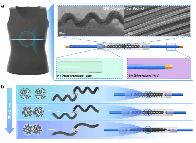 近日,五邑大學應用物理與材料學院、柔性傳感材料與器件研究開發中心羅堅義教授、黃愛萍教授、劉賢哲博士團隊報道了一種新型可拉伸碳纖維束應變傳感器(SCFBSS),該傳感器在0-40% 拉伸應變下表現出高度的線性度(R2=0.99601),且具有優異的抗干擾性能(對彎曲、扭曲不敏感)、長期耐用性和防水性等特點。此外,還進一步開發了一套可穿戴呼吸監測系統,不僅能精確分辨不同的呼吸模式,提高早期疾病診斷的準確性,還能遠程捕捉游泳過程中的實時呼吸信息,指導游泳訓練等。這表明,我們的可拉伸應變傳感器在用于健康監測和游泳運動呼吸訓練指導的可穿戴電子設備和智能服裝中具有巨大的應用潛力。