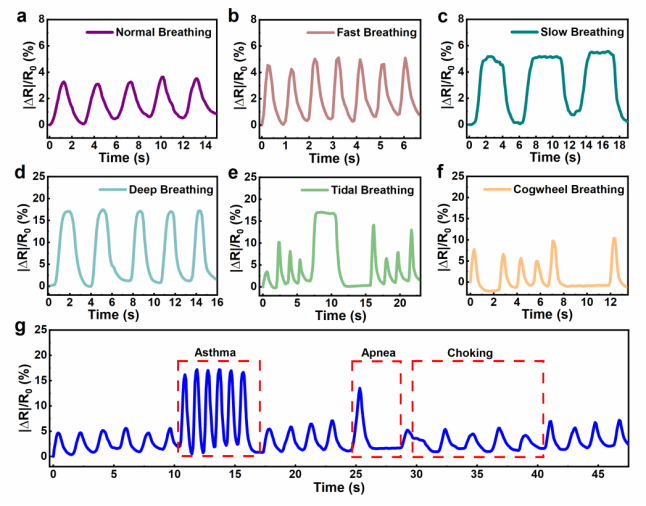 圖4 SCFBSS捕捉到的各種呼吸狀態:(a)正常呼吸;(b)快速呼吸;(c)緩慢呼吸;(d)深度呼吸;(e)潮式呼吸;(f)間斷呼吸;(g) 模擬異常呼吸的連續呼吸監測,包括哮喘、呼吸暫停和窒息。