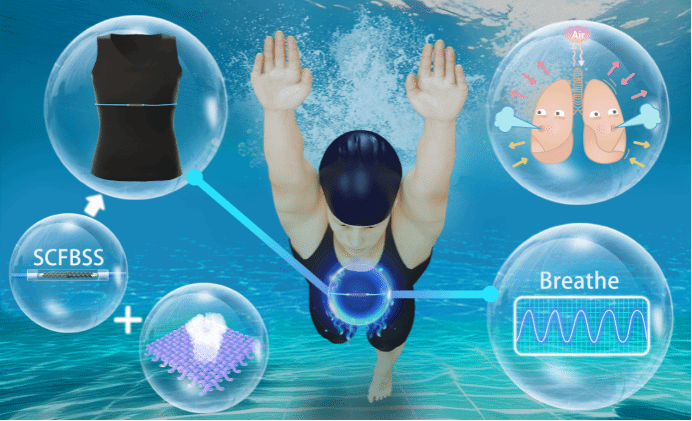 總之,基于CFB材料通過結構設計,制備出了一種新型SCFBSS,它具有出色的線性響應,能夠對呼吸時胸廓運動引起的拉伸應變做出響應。該傳感器具有出色的線性度(0~40% 拉伸應變下的 R2=0.99601)、抗機械干擾、優異的穩定性、長期耐用性和出色的防水性。與紡織背心集成在一起的SCFBSS對呼吸胸腔收縮和放松引起的輕微應變保持高靈敏度。它能精確捕捉呼吸的全部信息,有助于區分正常和異常的呼吸模式,提高醫療診斷的準確性。為了擴展SCFBSS的應用場景,我們開發了一種智能可穿戴呼吸監測系統,用于采集游泳時的實時呼吸信號,其數據可作為評估個人肺功能和指導游泳訓練的參考。結果表明,我們的智能可穿戴呼吸監測系統可為開發用于各種日常活動中健康監測和運動管理的智能服裝提供新的機遇。
