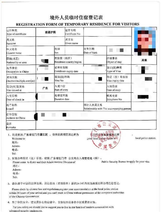 Foreigner Visa Application Form. This form can be obtained from the Jiangmen Exit-Entry Administration Bureau or the school office. It should be filled out completely and accurately.