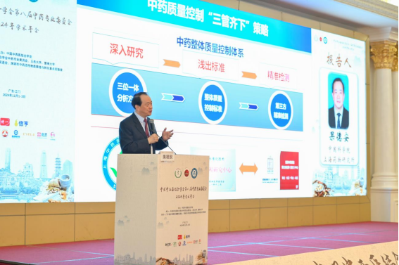 中國科學院上海藥物研究所研究員果德安以“中藥‘三管齊下’質控策略與實踐”為題,從中藥質量控制的重要性及面臨的問題出發,提出中藥質量控制“三管齊下”策略。他強調了創新中藥復雜體系“化學-代謝-生物”系統分析方法的重要性,以及中藥質量標準國際化的快速發展,著重介紹了中藥質量智能數據庫建設的進程及其臨床應用價值。