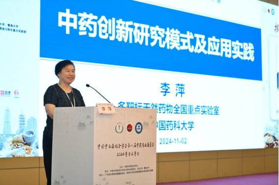 中國藥科大學教授李萍以“中藥創新研究模式及應用實踐”為題作大會主題報告。她在報告中從中醫藥整體觀與系統生物學角度,指出多靶標藥物在慢病防治的重要作用,著重介紹所在團隊以中藥等效群為抓手,以疾病代謝紊亂特征譜為切入點,探索中藥多成分調控模式與協同機制。她應用原創性成果,破解中藥產業“卡脖子”瓶頸,從而支持中藥產業高質量發展。