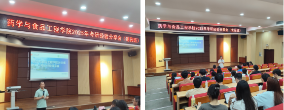 為精準助力制藥工程及食品科學與工程專業學生明晰考研方向,掌握備考技巧,我院于2025年5月8日-9日在馬蘭芳樓307報告廳分專業舉辦考研專題指導活動。學院生物與醫藥碩士點負責人彭金寶、兼職輔導員熊壯兩位專任教師出席并做趨勢分析,同時還邀請到7位保研、考研、調劑等方面有著成功經驗的學長學姐分享寶貴經驗,他們分別是來自大四制藥工程專業的林澤茵、方壯潮、周健榮、趙曉瑩同學和食品科學與工程專業的李泳嫻、莫梓均、黃靖瑤同學。兩場分享會分別由兩位大三年級班主任老師朗明和徐巨才老師主持。