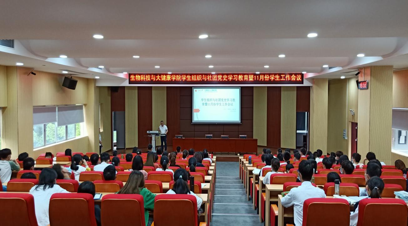 為進(jìn)一步加強(qiáng)學(xué)生干部管理和教育,11月2日,生物科技與大健康學(xué)院在馬蘭芳樓307報告廳召開學(xué)生組織與社團(tuán)黨史學(xué)習(xí)教育暨11月份學(xué)生工作會議。學(xué)院黨委副書記黃應(yīng)忠、輔導(dǎo)員以及學(xué)院“學(xué)生三會”、黨員服務(wù)中心、青年志愿者協(xié)會、心理工作委員會、職業(yè)與發(fā)展協(xié)會、記者團(tuán)與環(huán)境保護(hù)協(xié)會的全體學(xué)生骨干共計141人參加會議。