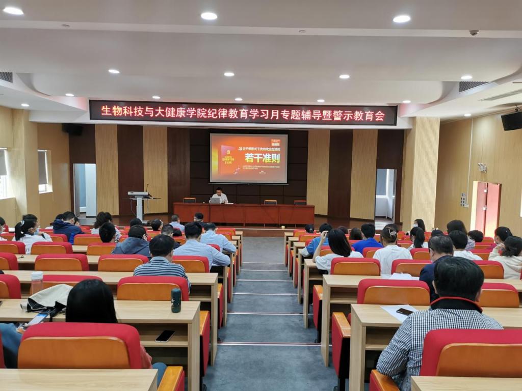 11月18日,生物科技與大健康學院在馬蘭芳樓307召開2021年紀律教育學習月專題輔導暨警示教育會,會議由學院黨委書記許皓主持,共計97名師生黨員參加。