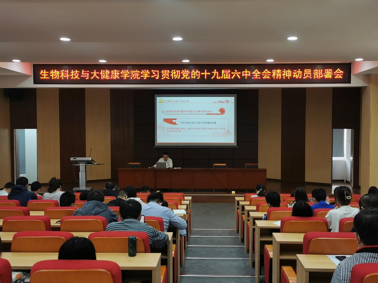 11月18日,生物科技與大健康學(xué)院在馬蘭芳樓307召開學(xué)習貫徹黨的十九屆六中全會精神動員部署會,會議由學(xué)院黨委書記許皓主持,共計97名師生黨員參加。