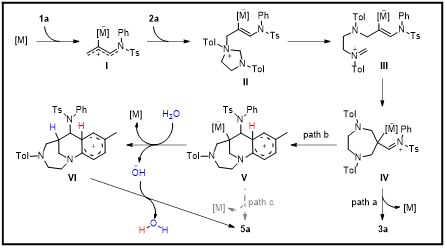 二氮雜環橋環體系廣泛存在于天然產物和藥物分子中。近年來發展了大量的方法學合成二氮雜環橋環體系,包括閉環復分解、環化、重排反應等策略。但是到目前為止,還沒有直接有效地合成含有七元二氮雜環橋環體系的反應。近日,五邑大學生物科技與大健康學院彭士勇副教授課題組報道了一種催化劑控制的咪唑烷與聯烯的環加成反應:金催化的[5+2]環加成反應生成七元二氮雜庚烷;鐵催化的[5+2]/Friedel-Crafts串聯反應生成七元二氮雜環橋環體系。