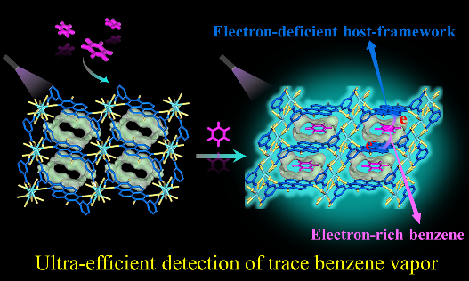 苯是一種具有致癌毒性的污染物,即使在低濃度下仍會嚴重危害人體健康。目前,對苯及其衍生物的檢測方法主要是采用氣相色譜法。然而這種方法存在設備昂貴、操作復雜等弊端,難以在公眾中推廣。此外,現有的傳感材料與苯分子之間的弱相互作用通常很難產生明顯的響應信號,更別提在痕量水平上進行檢測了。因此,要實現快速且便攜檢測室內痕量苯蒸汽仍然是一個巨大的挑戰。