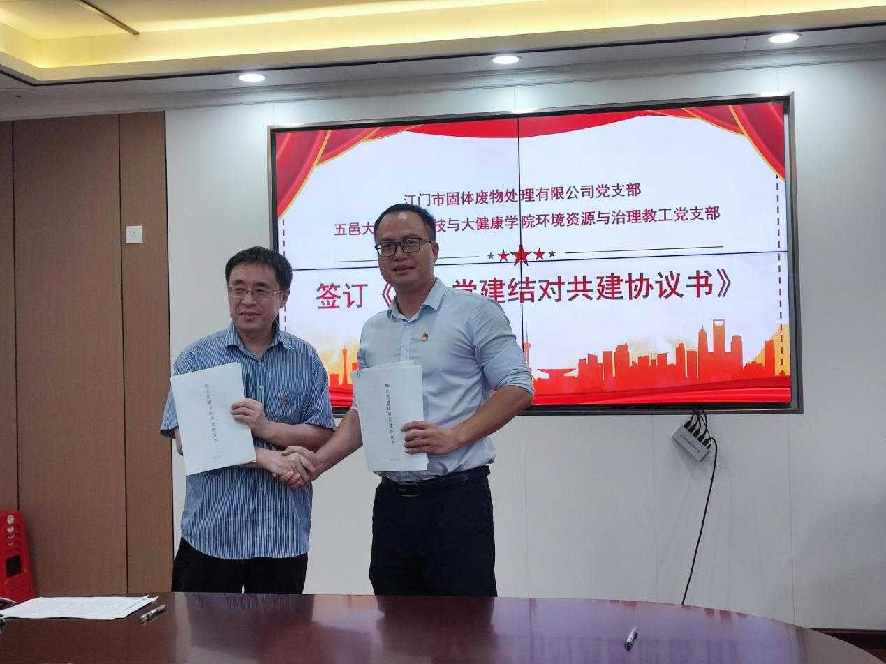 隨后,雙方結對共建黨支部書記李冰與劉金華分別代表黨建共建單位簽署黨建結對共建協議書,學院副院長徐學濤與江門市固體廢物處理有限公司副總經理張明代表雙方單位簽署校外實習基地建設協議書,并舉行產學研合作教育基地揭牌儀式。
