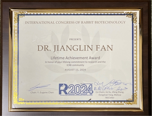 2024年8月11日在美國密西根大學召開的第9屆國際家兔生物技術及大動物模型轉化研究大會(The 9th International Congress of Rabbit Biotechnology and Large Animal Models for Translational Research)上,大會主席密西根大學Eugene Chen教授向五邑大學范江霖教授頒授了大會的終身成就獎(Lifetime Achievement Award)。這是本大會成立20年來第三次授予此項殊榮。