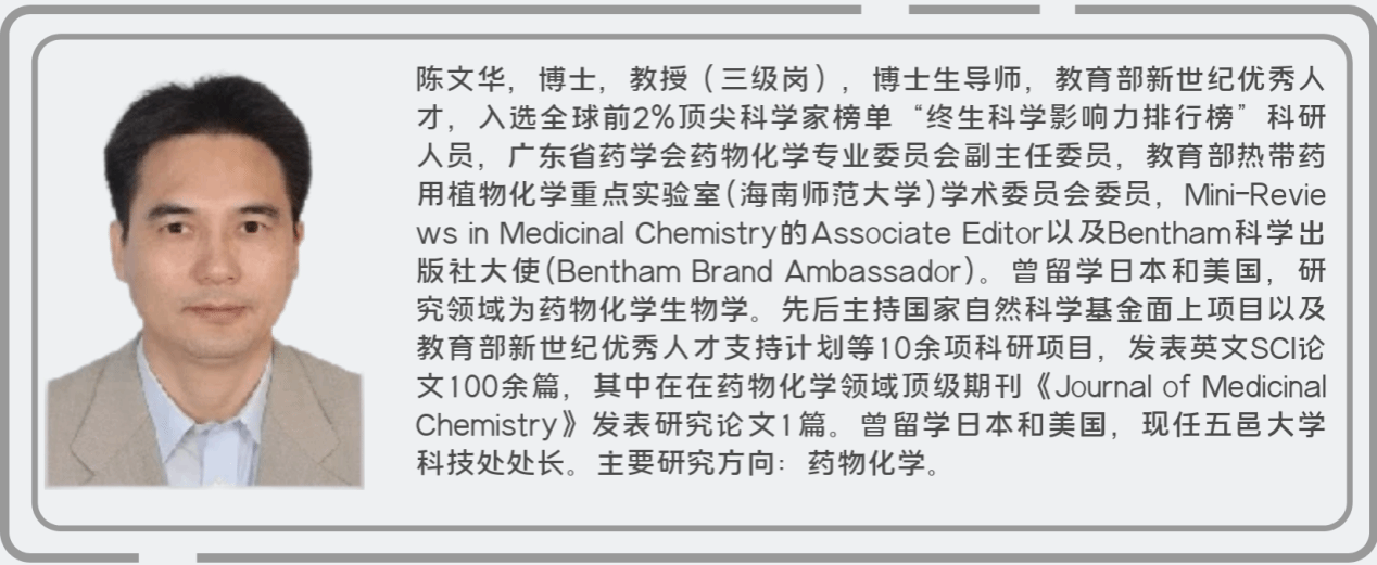 朱文堅,中共黨員,五邑大學2021屆應用化學(制藥工程)本科畢業生,2021年推免至中國藥科大學攻讀藥學專業碩士研究生。本碩期間均獲得一等學業獎學金、國家獎學金、優秀三好學生以及優秀畢業生等榮譽。目前參與發表SCI論文6篇,以第一作者身份參與發表2篇,第二發明人參與申請國家發明專利1項,2024年擬錄取為暨南大學藥物化學專業博士研究生。