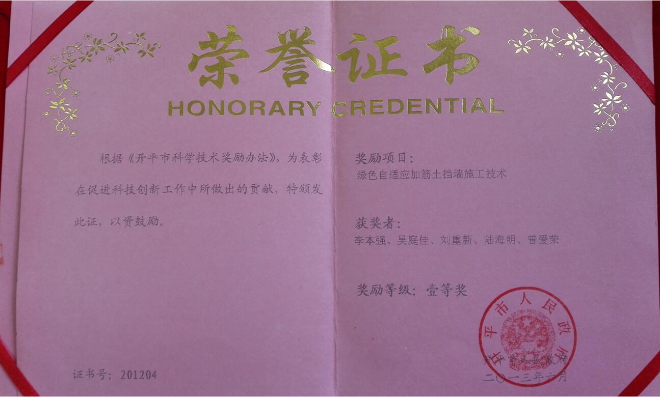2012-開平市科學技術獎一等獎-李本強《綠色自適應加筋土擋墻施工技術》