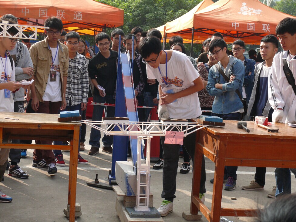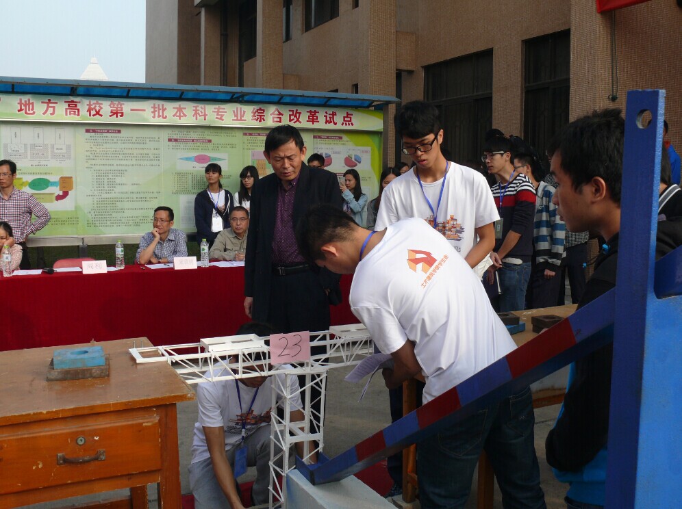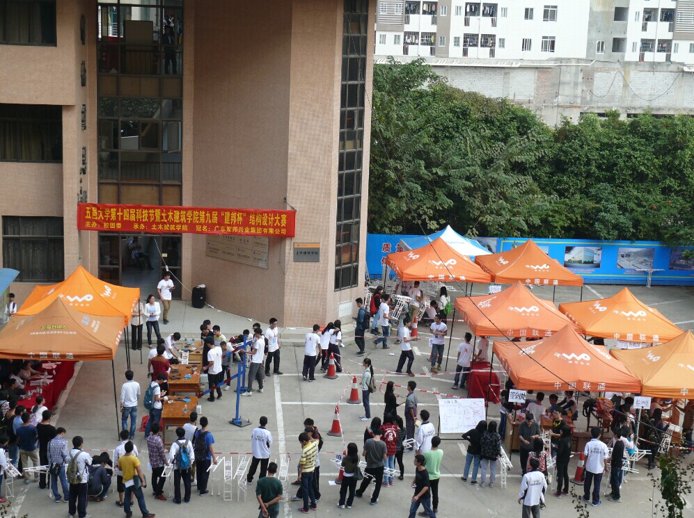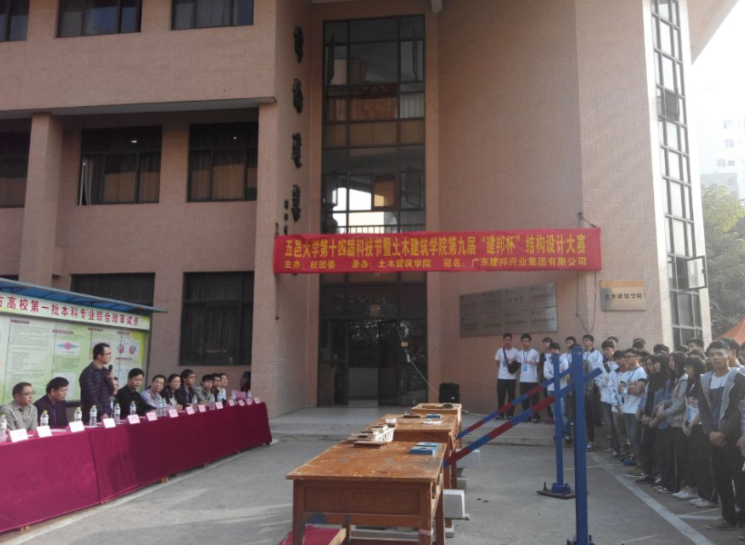 11月23日,由共青團(tuán)五邑大學(xué)委員會主辦、土木建筑學(xué)院承辦的第十四屆科技節(jié)暨土木建筑學(xué)院第九屆“建邦杯”結(jié)構(gòu)設(shè)計大賽在偉倫建筑館前隆重舉行。校團(tuán)委書記徐煥立、廣東建邦興業(yè)集團(tuán)有限公司總工程師劉重新等嘉賓以及土建學(xué)院領(lǐng)導(dǎo)出席了比賽。學(xué)院7名專業(yè)老師擔(dān)任大賽的評委。
