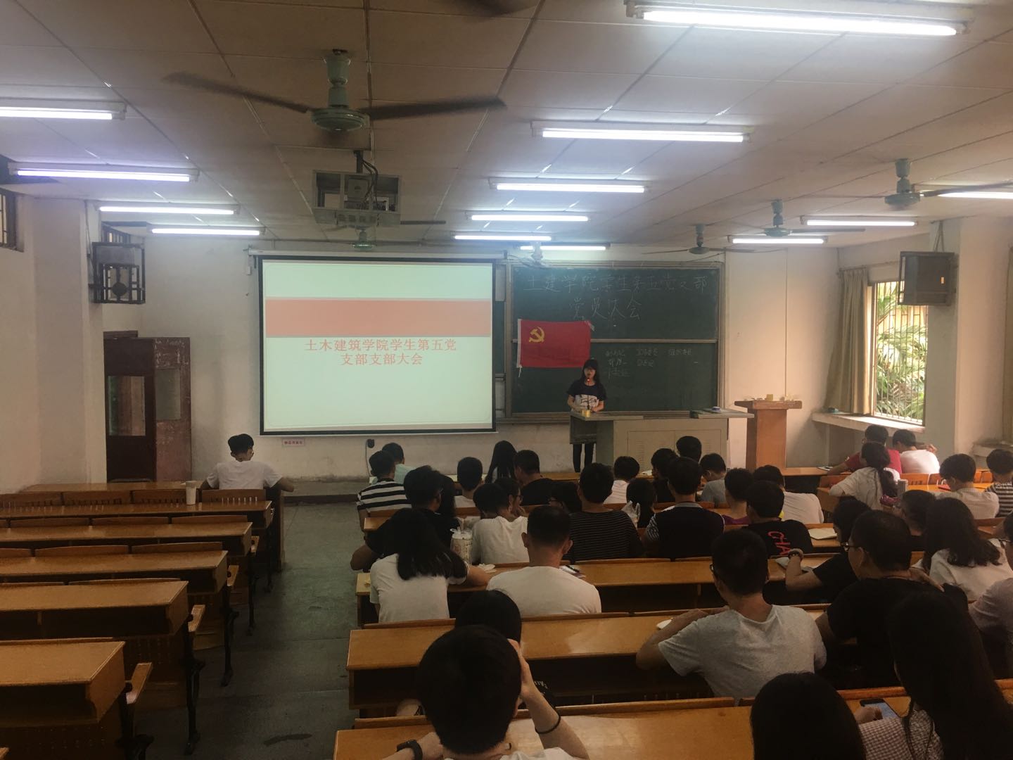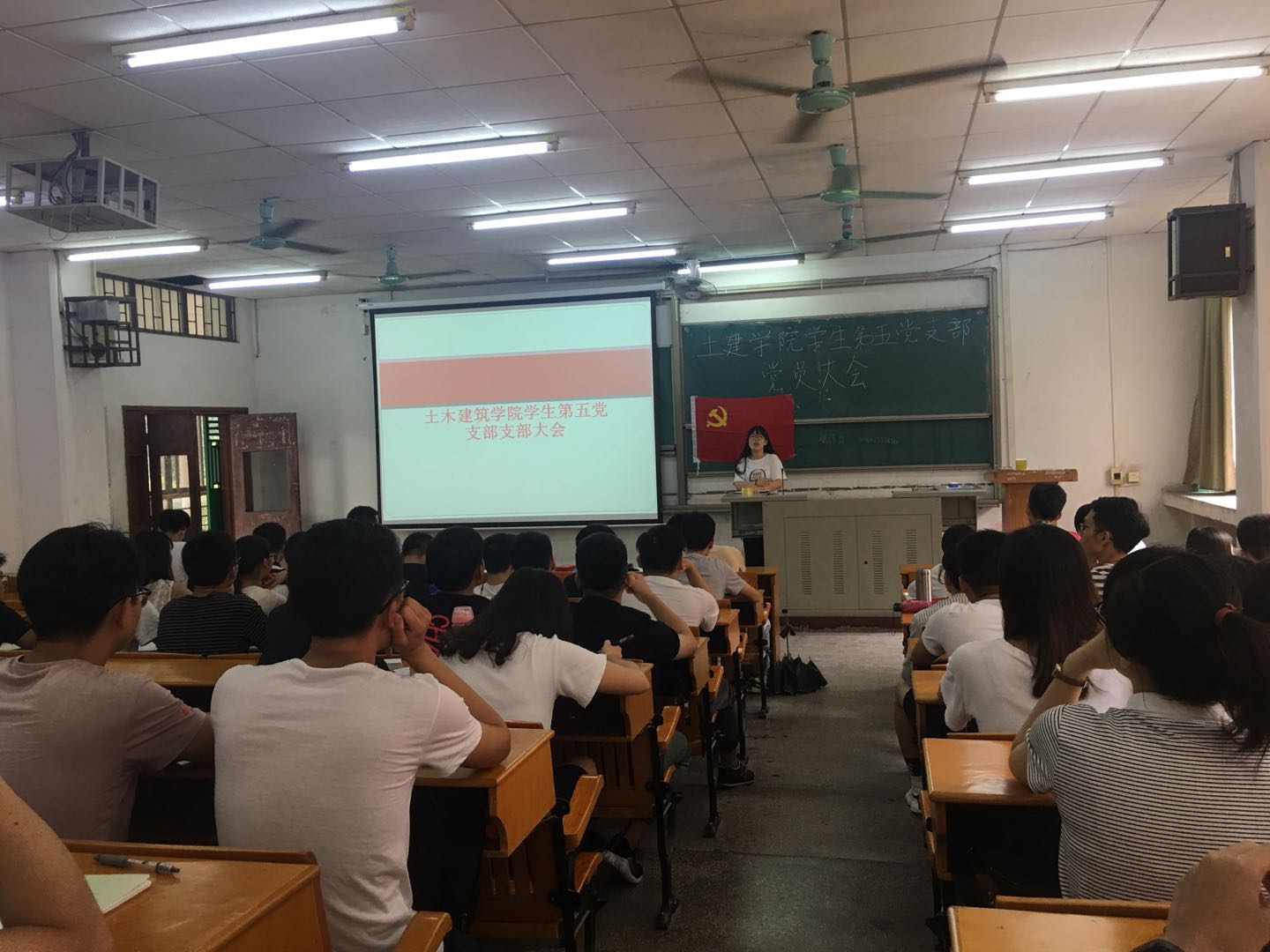 會議伊始,由周婷婷同志傳達了這學期的主要工作安排,包括新生黨員檔案接收工作、畢業黨員組織關系轉接工作、“三會一課”和主題黨日活動等,給全體黨員詳盡布置這學期的工作內容。支部書記胡偉堅老師進行講話,歡迎新生黨員加入土木建筑學院學生第五黨支部這一大家庭,并對支部委員候選人、黨小組副組長的競選進行動員。