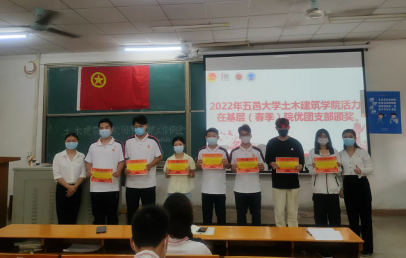 會議尾聲,李嘉燕老師和陳桂老師共同為2022年五邑大學土木建筑學院活力在基層(春季)院優團支部頒獎并合影留念。