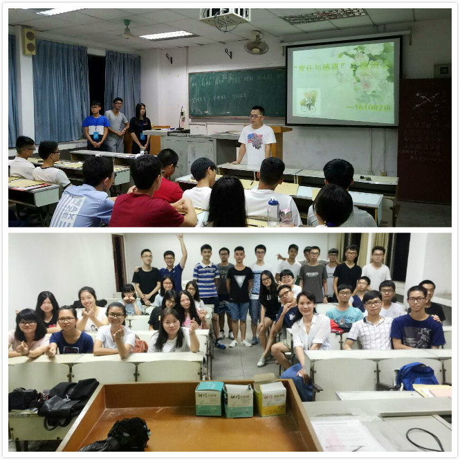 161001班的班會是由學長陳家穎主持。我們有幸邀請到周昊老師參與此次會議。首先,家穎學長簡明扼要地說明了此次班會的目的與意義所在,接下來就是周昊老師通過精彩地講訴自己的人生經歷,明確精簡地向同學們“回歸初心”,引出感恩,責任,并不僅僅是虛化的空泛的書面意義上的詞匯,而是潛藏在生活的瑣屑中,潛藏在日常周圍平凡的一言一行中。父母,親人,師長,朋友,同學之間,親情,友情,往往以默默的,不易覺察的方式存在著。最后則是以大合照來結束此次班會。