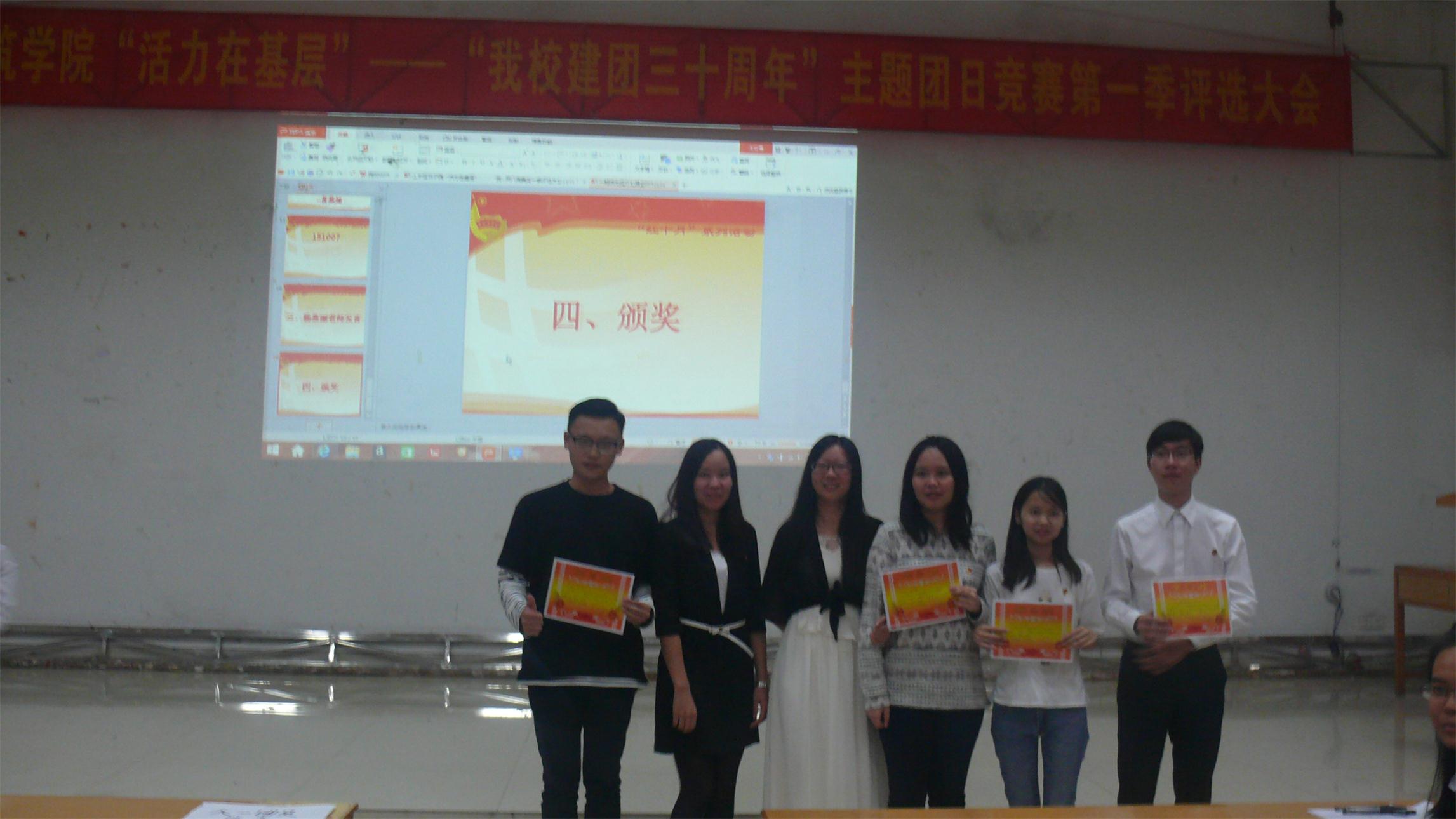會中,我院全體大二大三團支部作一期活力提升工程主題團日活動成果展示。成果展示有提倡走到自我鍛煉體魄的騎行健身活動,有參觀梁啟超故居后作名人故居保護規劃造價案分析的交流學習活動……各式各樣的團日活動,展現了土建學院各團支部積極向上的精神,體現了我院各團員積極響應學院號召的團日活動。期間還有互動環節,主持人向觀眾提問有關我校校訓、此次大會主題和活力計劃的時間等問題,讓觀眾不忘校訓,貼近主題。各團支部成果展示完后,楊老師發表講話,對各團支部一期團日活動工作作出評價,同時也向各團支部二期團日活動內容提出建議。經過一輪的評比,141007團支部獲得一等獎,151005、151004團支部獲得了二等獎,151006、151001、141004團支部獲得了三等獎。此次評選會圓滿結束。