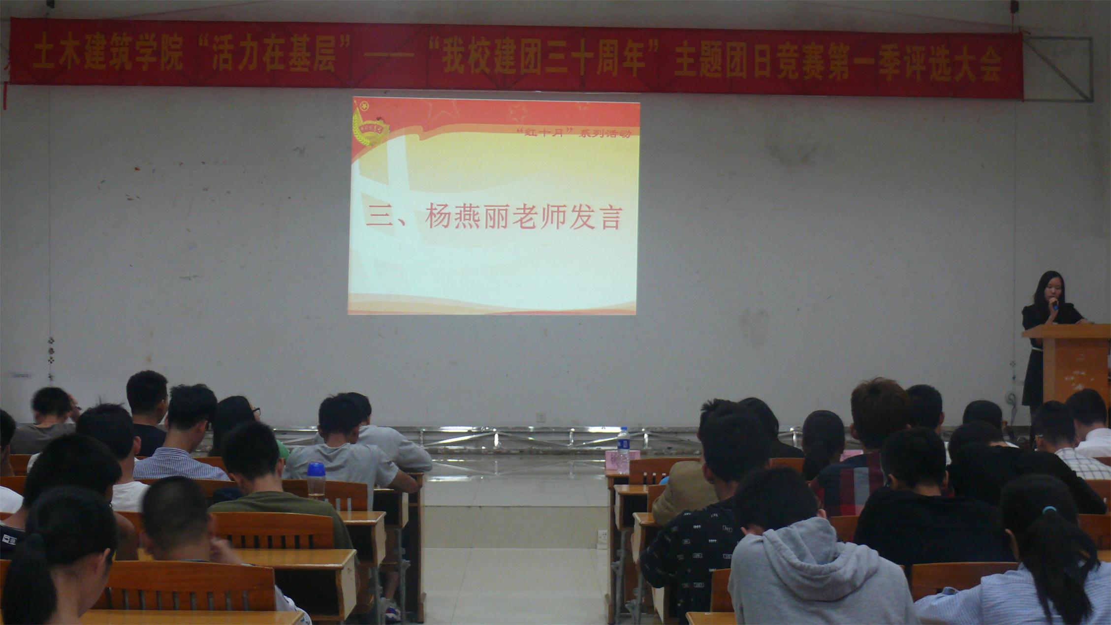 11月6日下午,土木建筑學院于活動中心舉辦了“活力在基層”——“我校建團三十周年”主題團日競賽第一期評選大會。土建學院團總支書記楊燕麗老師、輔導員王穎馨老師、常務副書記張藍宇、副書記鄧博文、邱詩敏、趙曉欣出席并擔任本次評選會評委,我院各團支部團支委、團員代表以及團總支全體成員參加了本次會議。