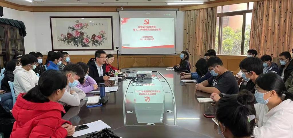 2022年1月10日,土木建筑學院于偉倫建筑館308會議室組織開展疫情防控宣傳教育暨2022年寒假離校安全教育會議。學院輔導員夏夢雪、胡偉堅、謝婭婷等,以及各班班長、副班長參加會議,會議由胡偉堅主持。