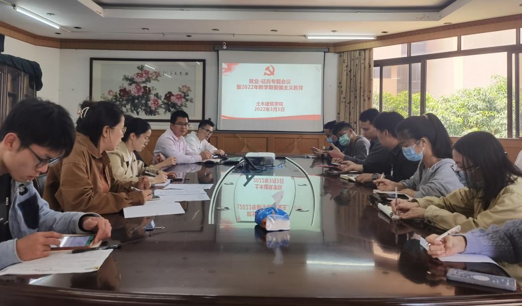 為深入貫徹習近平新時代中國特色社會主義思想和習近平強軍思想,持續推進一年兩次征兵工作,順利完成學院2021-2022年度征兵工作目標,土木建筑學院于2022年3月3日在偉倫建筑館308會議室舉行了“就業-征兵專題會議暨2022年新學期愛國主義教育會”。學院輔導員老師和主要學生班干部參加會議。會議由學院黨委委員、負責征兵工作輔導員胡偉堅主持。