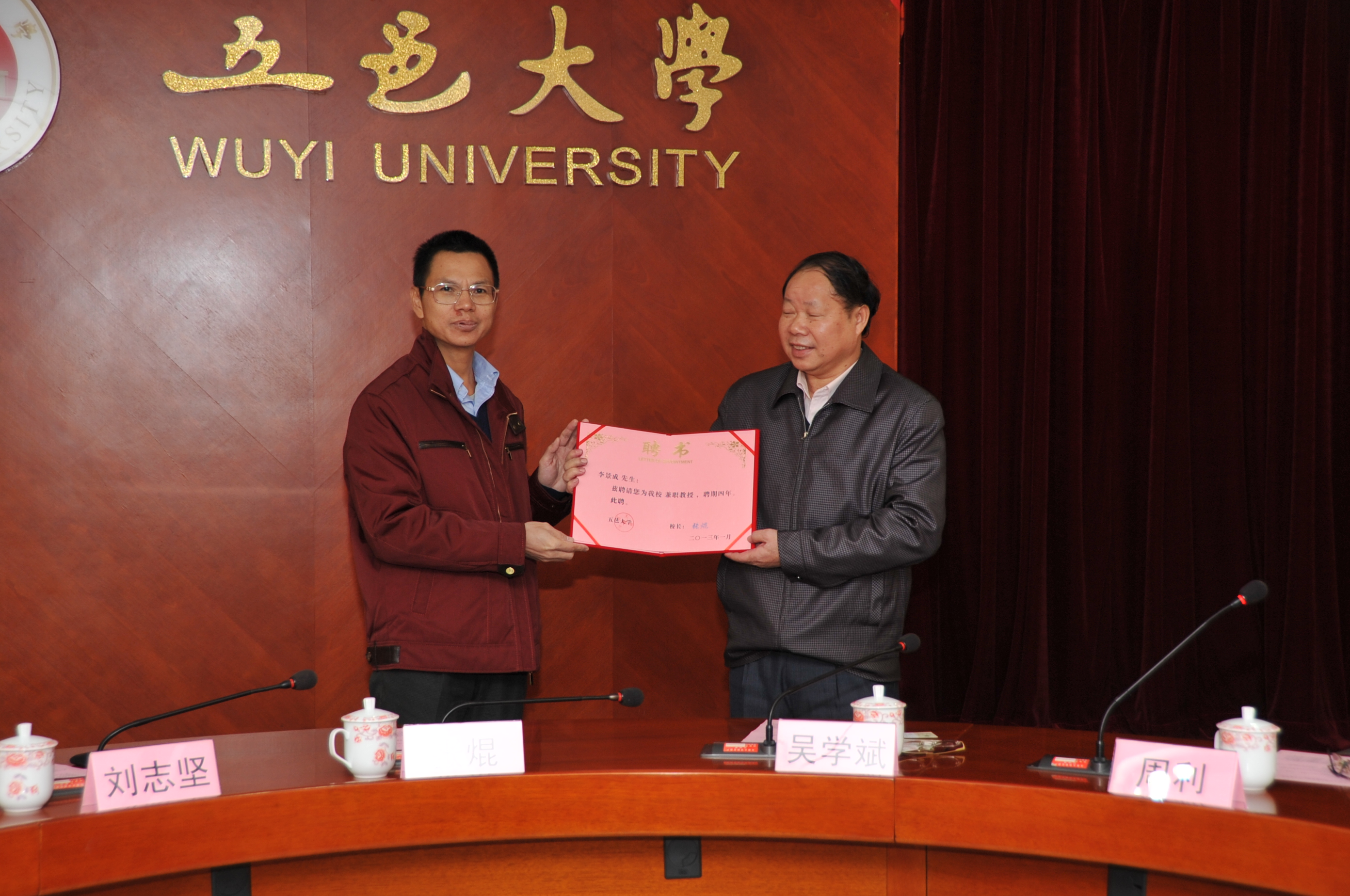 張焜校長(左)頒發(fā)兼職教授聘書給李景成(右)2013-1-8