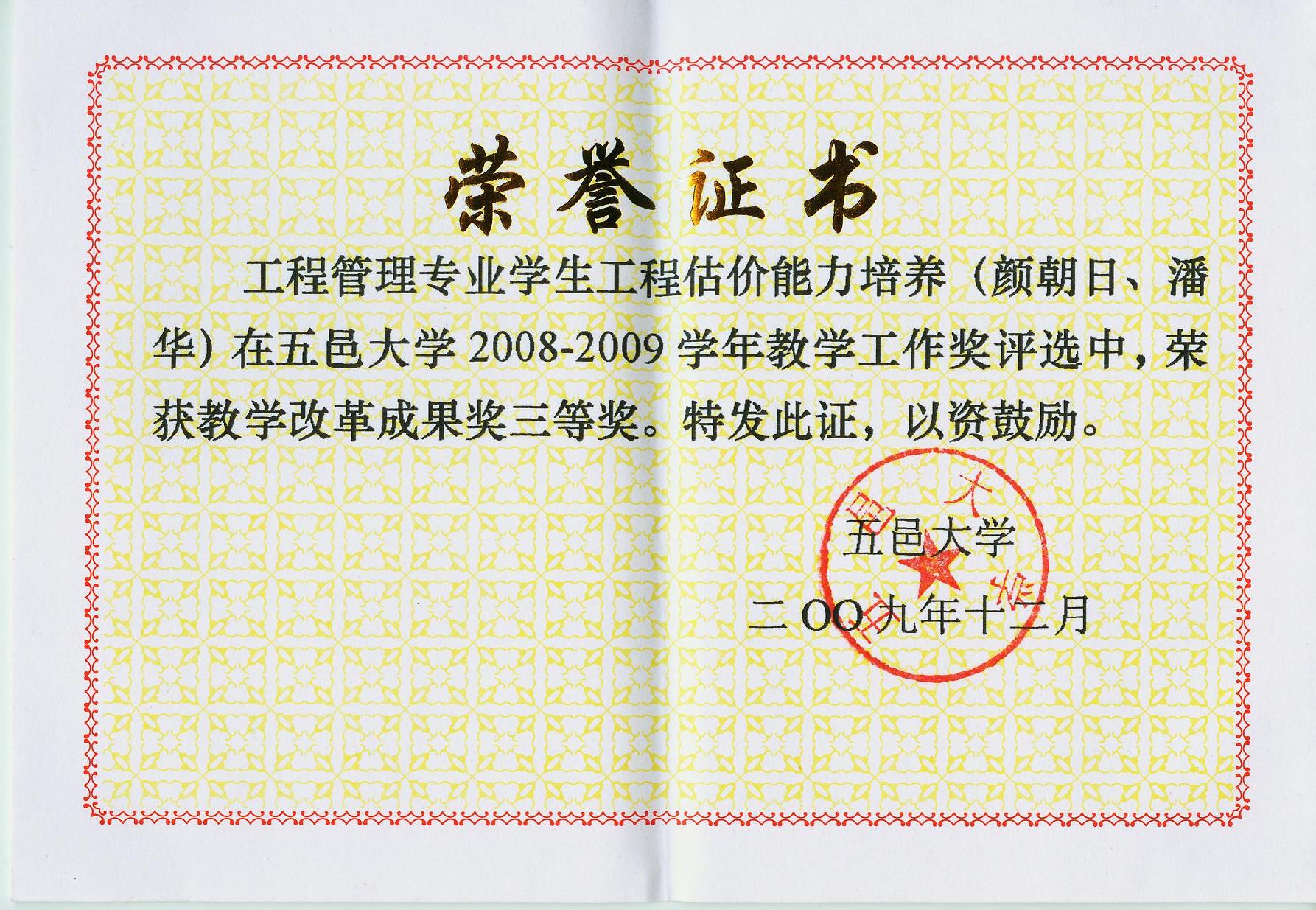 工程管理專業學生估價能力培養(顏朝日、潘華)榮獲五邑大學2008-2009學年教學改革成果獎三等獎