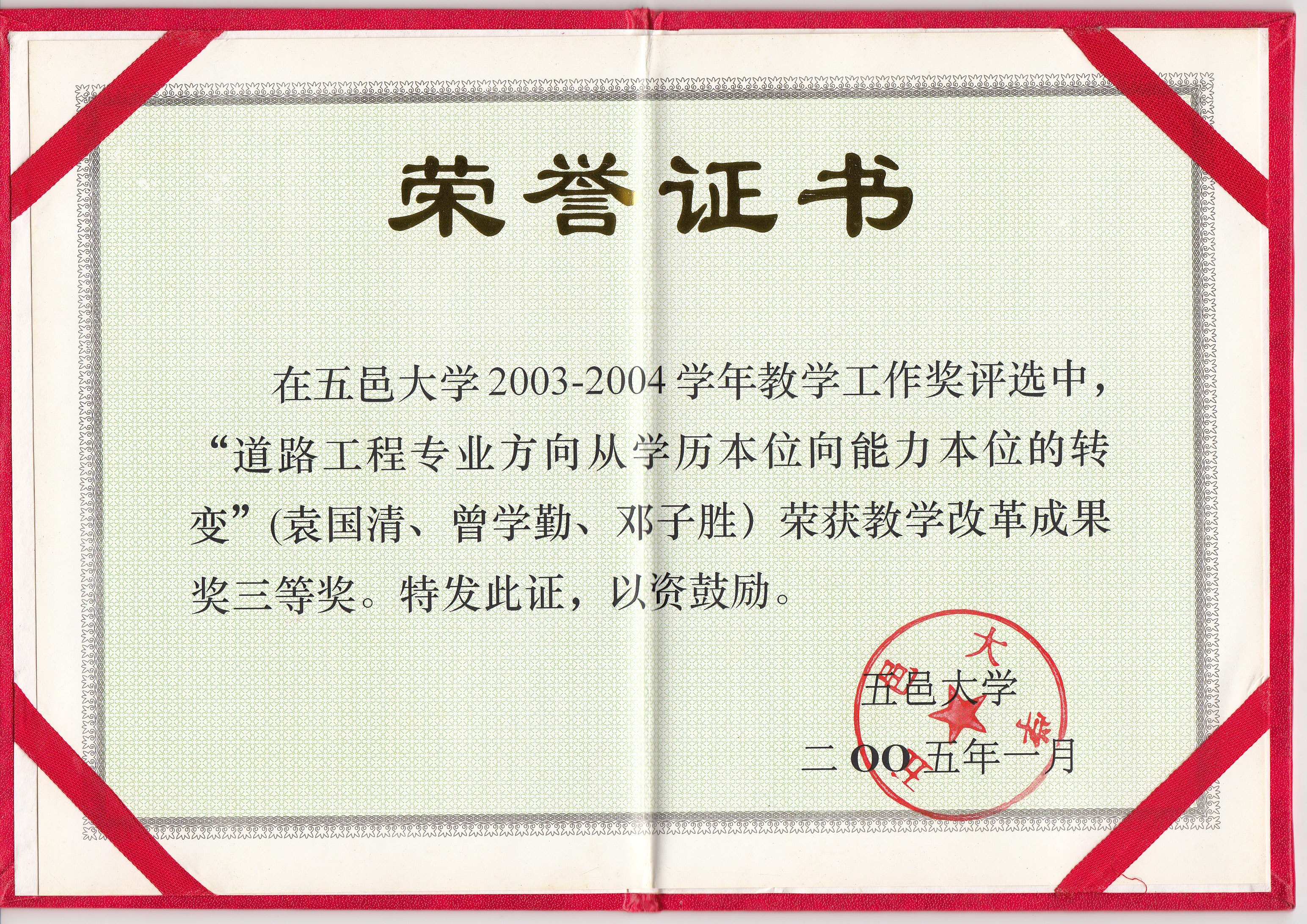 道路工程專業(yè)方向從學(xué)歷本位向能力本位的轉(zhuǎn)變(袁國清、曾學(xué)勤、鄧子勝)榮獲五邑大學(xué)2003-2004學(xué)年教學(xué)改革成果獎三等獎