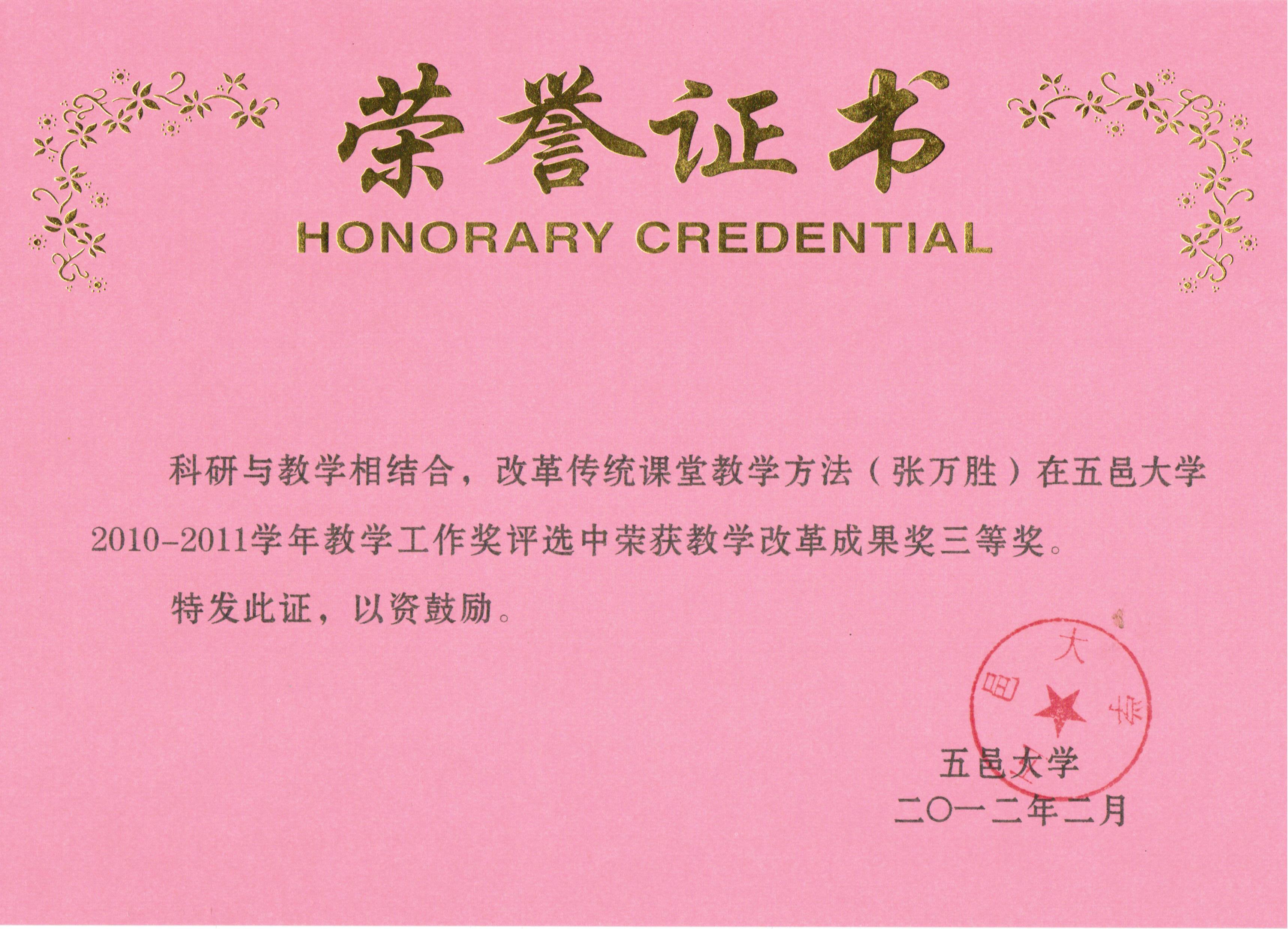 科研與教學相結合,改革傳統(tǒng)課堂教學方法(張萬勝)榮獲五邑大學2010-2011學年教學改革成果獎三等獎