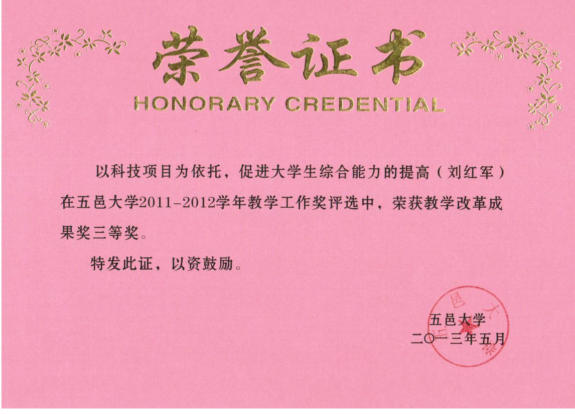 以科技項目為依托,促進(jìn)大學(xué)生綜合能力的提高(劉紅軍)榮獲五邑大學(xué)2011-2012學(xué)年教學(xué)改革成果獎三等獎