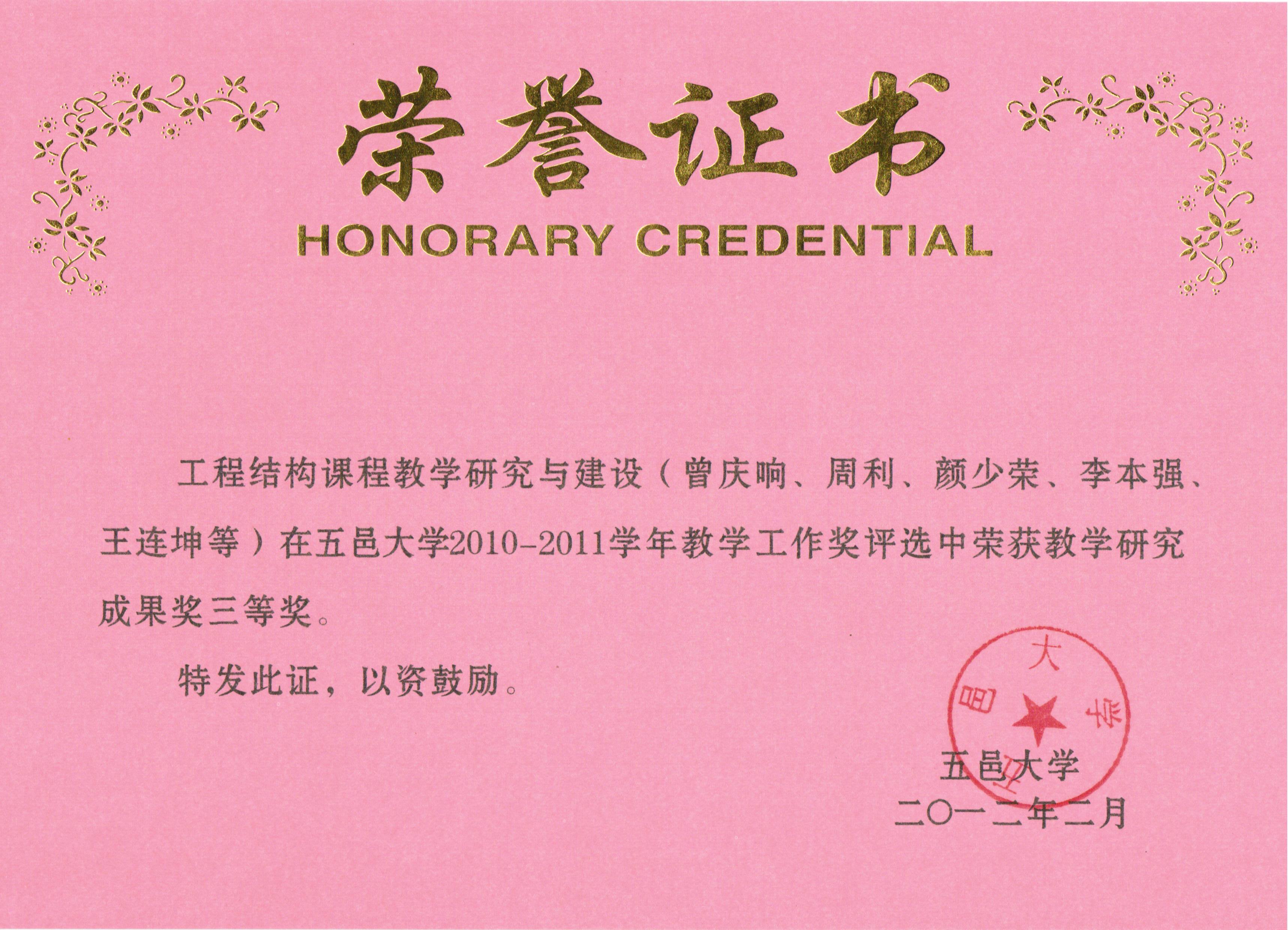 工程結構課程教學研究與建設(曾慶響、周利、顏少榮、李本強、王連坤等)榮獲五邑大學2010-2011學年教學研究成果獎三等獎
