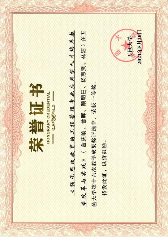 五邑大學(xué)第十六次教學(xué)成果獎(jiǎng)(高等教育類)一等獎(jiǎng)——強(qiáng)化思政教育的工程管理專業(yè)應(yīng)用型人才培養(yǎng)教學(xué)改革與實(shí)踐
