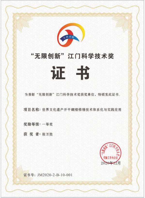 張萬勝-2020-《世界文化遺產(chǎn)開平碉樓修繕技術(shù)體系化與實踐應用》-2020年度“無限創(chuàng)新”江門市科學技獎一等獎