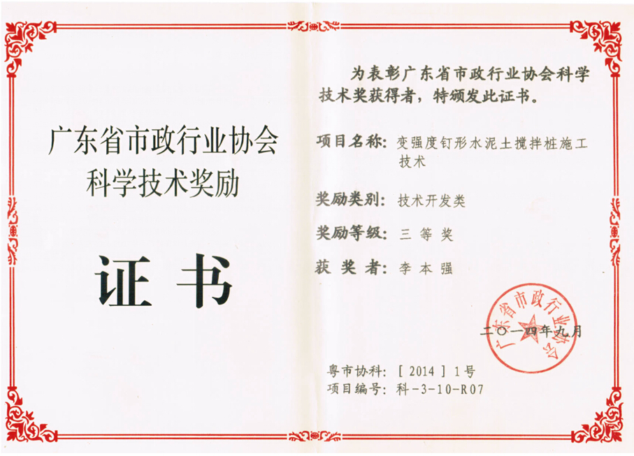 2014-廣東省市政行業(yè)協(xié)會科學(xué)技術(shù)獎(jiǎng)勵(lì)三等獎(jiǎng)-李本強(qiáng)《變強(qiáng)度釘形水泥土攪拌樁施工技術(shù)》