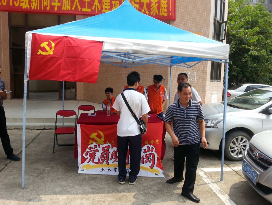 2015年9月13日,為迎接新生,做好新生接待工作,發(fā)揮黨員的先鋒模范精神,土木建筑學(xué)院學(xué)生黨支部在院樓前空地設(shè)立黨員服務(wù)崗服務(wù)廣大新生、家長。