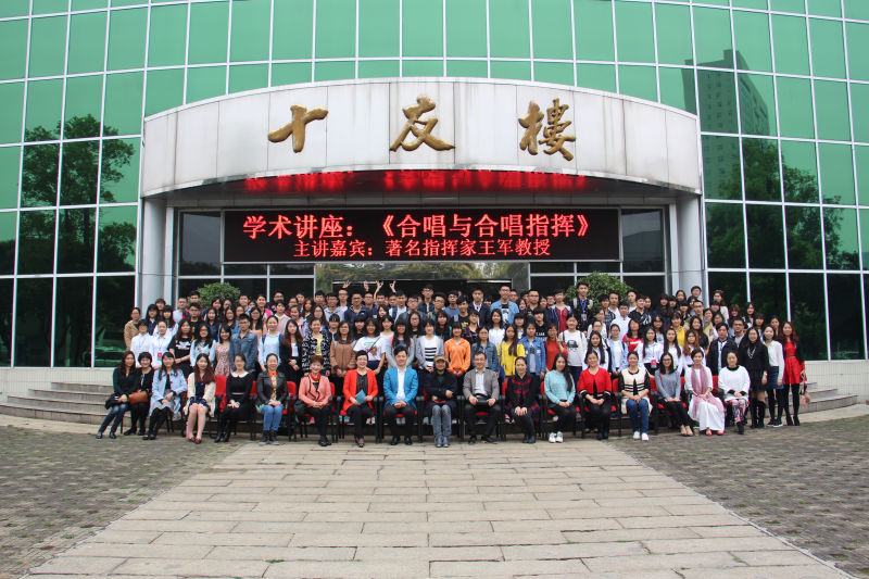 王教授主要圍繞“欣賞音樂的三階段和合唱指揮的特點和指揮時各項基本要求”進行論述。另外,王教授他親自教現場的同學們進行指揮的簡單練習。在整個講座過程中,到場的每一個人都認真的聽主講人王軍教授的演講,并且大部分人都積極參與其中。現場的氣氛帶動的很活躍,收效很好。