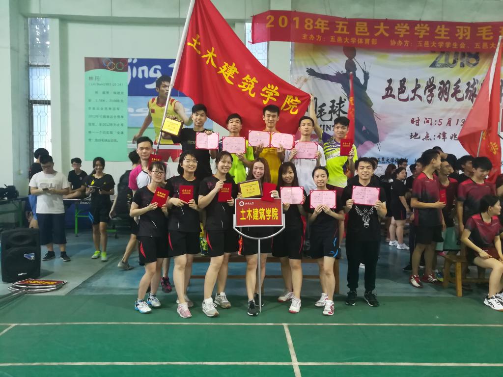 本次羽毛球比賽本著“以球會(huì)友”的原則舉行的,促進(jìn)了土木建筑學(xué)院與其他學(xué)院的友好交流,充分體現(xiàn)了土木建筑學(xué)院的羽毛球?qū)嵙驼_的比賽精神。他們?cè)诒荣愔兴麄凅w現(xiàn)出了不服輸?shù)木瘢麄儗?duì)比賽的那份堅(jiān)持,值得我們?yōu)樗麄兒炔剩瑲v時(shí)兩天的五邑大學(xué)羽毛球賽在5月20日上午完美落幕。最終,在選手們激烈的拼搏后,我院羽毛球健兒取得了男子團(tuán)體冠軍和女子第六名的優(yōu)異成績(jī)。(土木建筑學(xué)院)