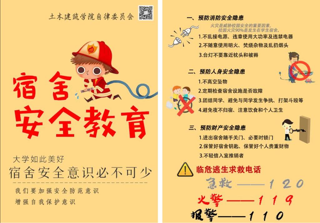 為提高土木建筑學院各年級的所有宿舍的安全防范意識,增強學生的自我保護意識,土木建筑學院律委會近期對院內所有宿舍進行了安全教育,以及相關傳單的派發。力求營造出所有學生對“大學生活如此美好,宿舍安全意識必不可少”的共識。