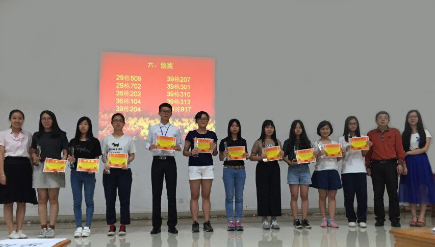 會上,吳書記提出我們要加強學風建設、規范宿舍管理的要求,并宣讀了《關于表彰土木建筑學院2015-2016學年第一學期十大優秀學生宿舍的決定》。隨后,十大優秀學生宿舍代表通過精彩的PPT演講,介紹其成績及經驗做法,給全院學生起到良好示范作用。接著,由吳書記和輔導員老師為優秀宿舍代表頒獎。然后,王老師對此次表彰大會進行總結,希望以后會有更多的宿舍參評。最后楊老師對連續五屆獲獎的宿舍進行表揚,并希望獲獎的宿舍能夠繼續保持做好榜樣。