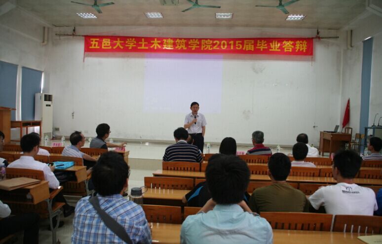 土木建筑學院2015屆公開畢業答辯會,于2015年6月4日,在學生活動中心二樓報告廳舉行。本次答辯會邀請了江門市建設局原副總工、江門市土木建筑學會原理事長曾昭炎高級工程師、江門市建筑設計院總工汪大勇高級工程師、廣東金輝華集團有限公司副總工陳達華高級工程師、河北省交通規劃設計院廣東分院院長程賢志高級工程師,以及江門市建設監理顧問有限公司黃文斌高級工程師,學校張國雄副校長出席了答辯會。會議由劉紅軍教學副院長主持,周利院長兼黨總支書記、張國雄副校長分別講話。
