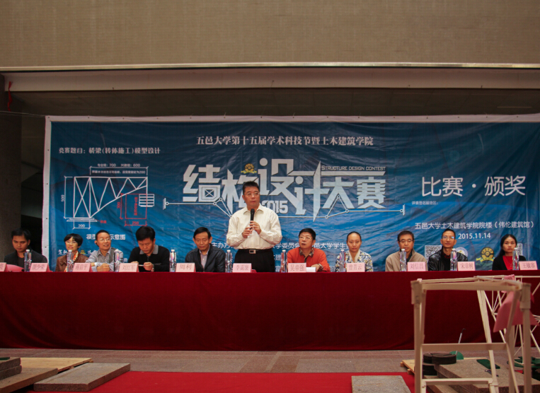 2015年11月14日,由共青團五邑大學委員會、五邑大學學生會主辦、土木建筑學院承辦的在我校南主樓二樓大廳隆重舉行。出席本次比賽的有五邑大學黨委李靄康副書記、團委曾青云副書記、土木建筑學院黨總支吳卓強書記、周利院長、劉紅軍副院長,本次大賽的評委由我院劉信昌教授級高工、蔣啟平副教授、顏少榮副教授、宋章樹高級工程師、王敏容博士、陳孔亮博士擔任。