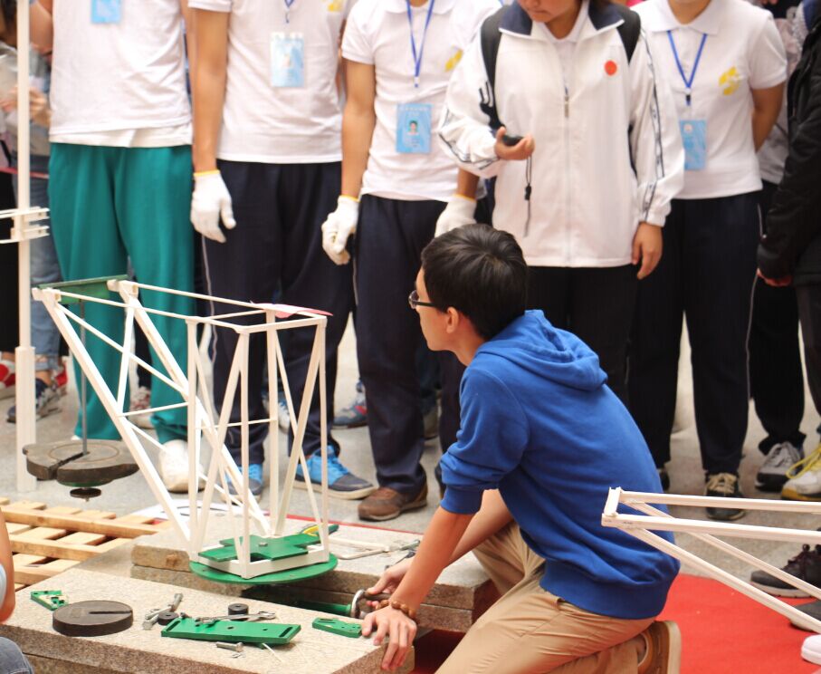 本次結(jié)構(gòu)模型以PVC塑料線槽、502膠水和砂紙為制作材料,以橋梁(轉(zhuǎn)體施工)模型設(shè)計為題目,考驗同學們的專業(yè)理論水平與實踐應(yīng)用能力,具有重要的現(xiàn)實意義和工程針對性。來自14個不同學院的將近兩千名同學參加了比賽,其中,專業(yè)組103組,興趣組516組。每組作品都提前一天進行收集、測量和整理,比賽當天再由工作人員拿到現(xiàn)場,分別進行第一級重量加載測試和第二級重量加載以及結(jié)構(gòu)轉(zhuǎn)體測試,從而檢測模型的受力情況以及結(jié)構(gòu)轉(zhuǎn)體能力。評委老師就選手的方案書、模型構(gòu)造,以及現(xiàn)場測試成績進行綜合評定。