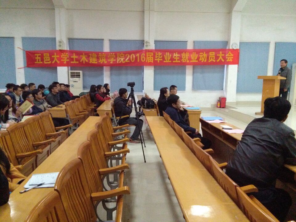 12月8日晚上,土木建筑學院在學校活動中心二樓報告廳召開2016屆畢業生就業動員大會,出席本次大會的有土木建筑學院院長周利老師、黨總支書記吳卓強老師、副院長劉紅軍老師、各專業系主任、2016屆畢業班班導師以及我院2016屆畢業班學生,會議由輔導員楊燕麗老師主持。